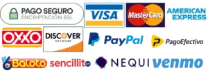 Aceptamos tarjetas de crédito y débito (Visa, Mastercard y Amex), Nequi, PSE, Bancolombia y PayPal.